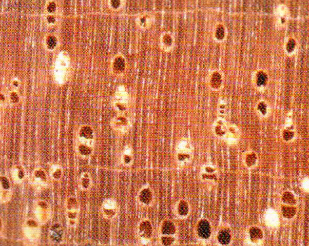 散孔材。管孔肉眼下明顯,甚少,略大;主為單管孔,少數(shù)徑列復管孔(2~3個);具白色沉積物。軸向薄壁組織放大鏡下略見,環(huán)管束狀及輪界狀。木射線放大鏡下可見,略密,甚窄。