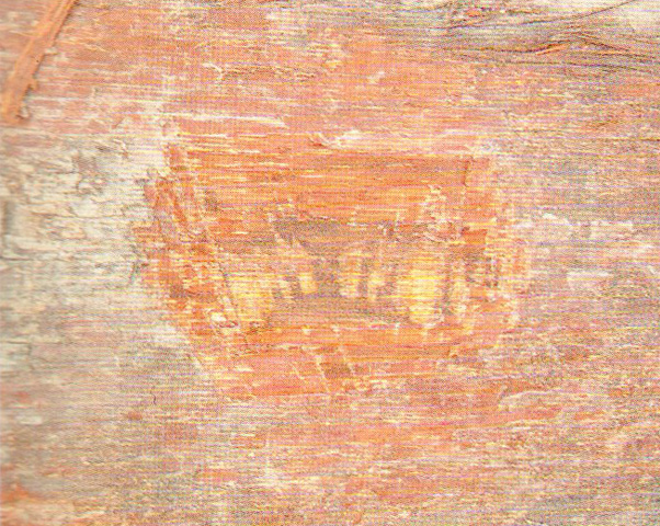 心邊材區(qū)別明顯。心材淺黃褐色,久則轉(zhuǎn)為巧克力褐色。邊材窄,金黃色。生長輪略可見。